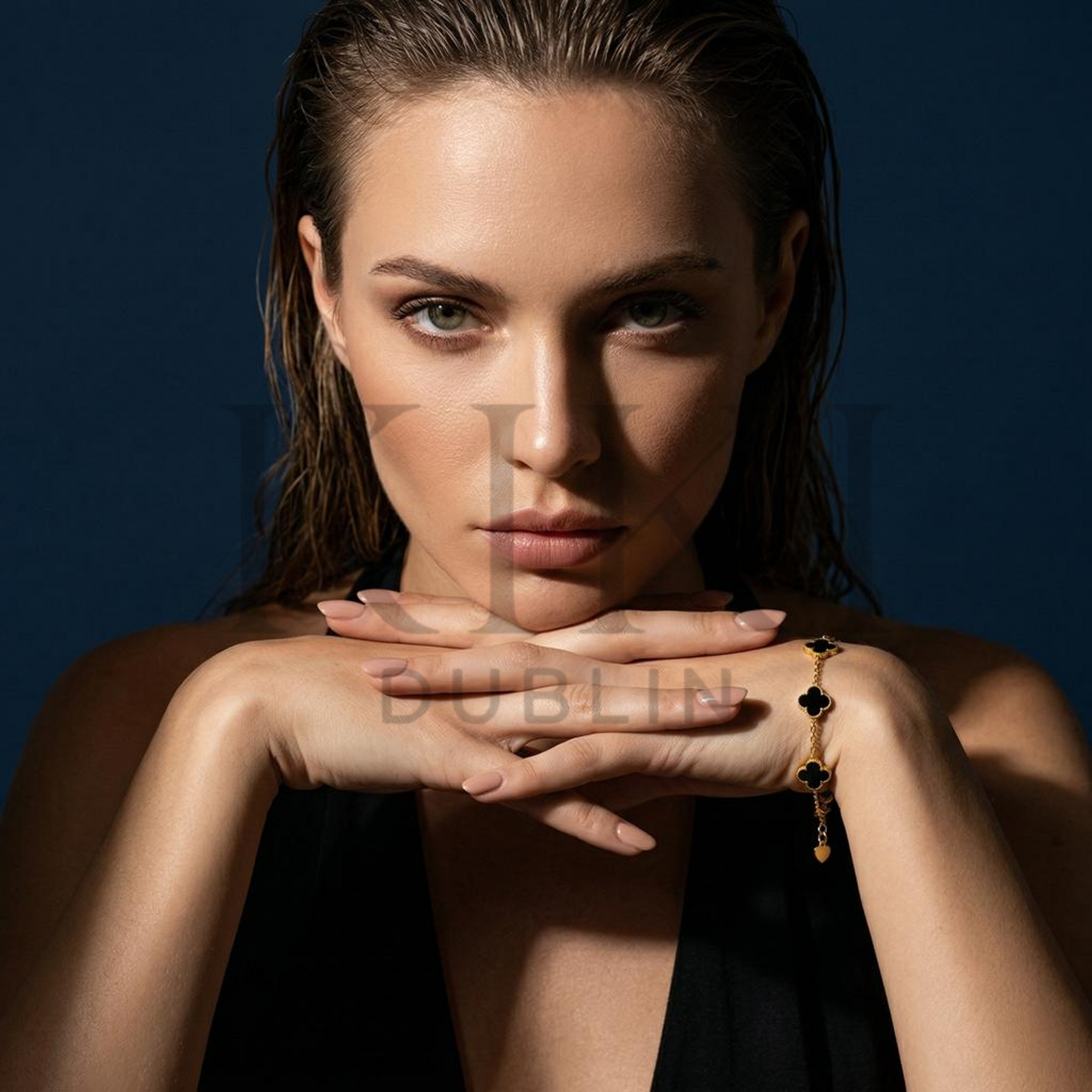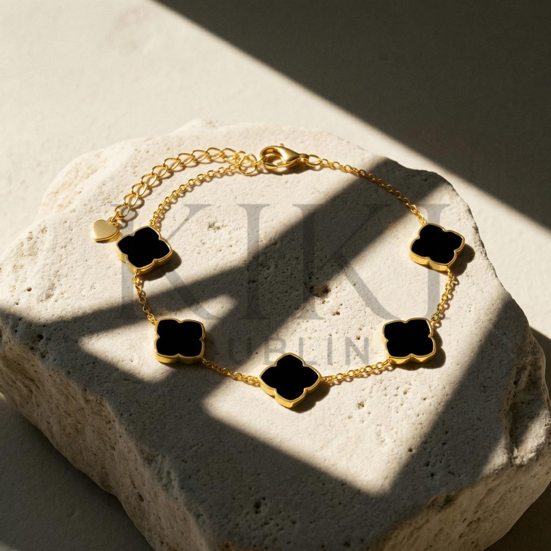 The Lumière Noir Bracelet features five polished black enamel motifs, evenly spaced along a delicate chain for a perfectly balanced silhouette. The deep tone paired with a sleek metal finish creates a look that feels both timeless and modern.